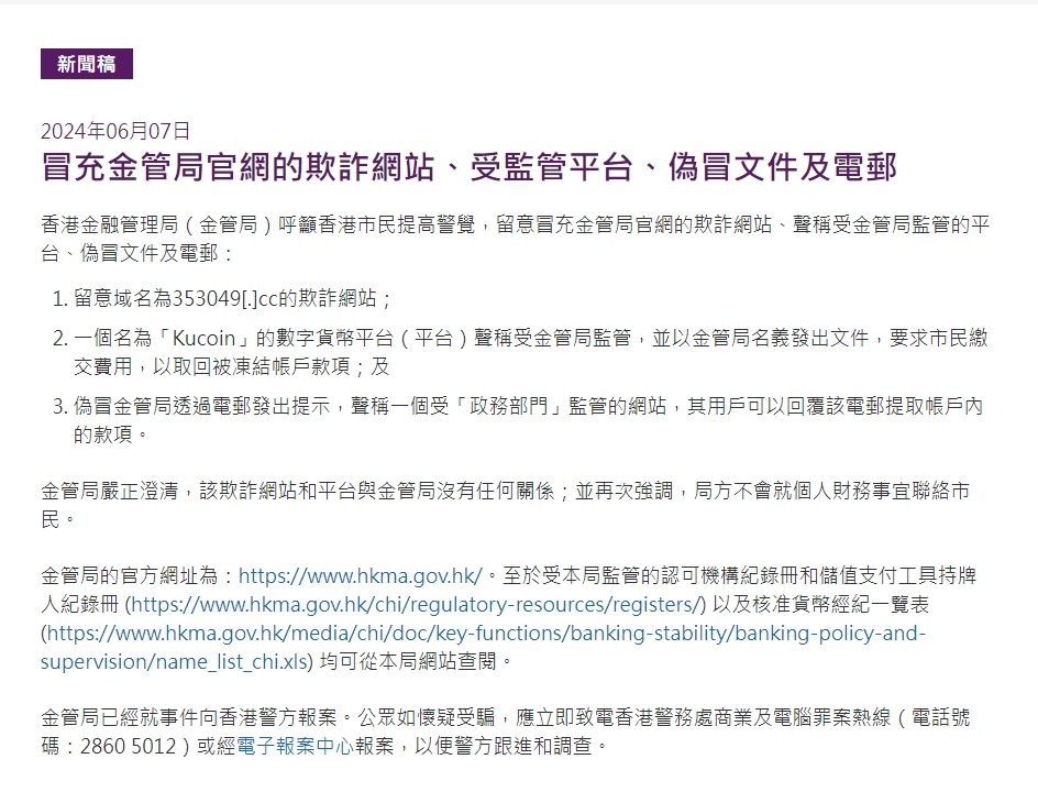 Aiying reported that the Hong Kong Monetary Authority issued a press release on fraudulent websites, regulated platforms, fake documents and emails impersonating the official website of the Hong Kong Monetary Authority, calling on Hong Kong citizens to be vigilant and pay attention to fraudulent websites impersonating the official website of the Hong Kong Monetary Authority, platforms claiming to be regulated by the Hong Kong Monetary Authority, fake documents and emails, including paying attention to a fraudulent website with the domain name 353049[.]cc; a digital currency platform called "Kucoin" claimed to be regulated by the Hong Kong Monetary Authority and issued documents in the name of the Hong Kong Monetary Authority, requiring citizens to pay fees to retrieve frozen account funds. The Hong Kong Monetary Authority stated that it has reported the incident to the Hong Kong police, clarifying that it has nothing to do with it and will not contact citizens regarding personal financial matters.