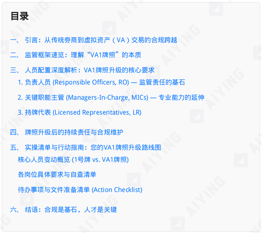 This Aiying report aims to provide an authoritative and comprehensive guide for management, Compliance Officers (COs), and Responsible Officers (ROs) of licensed corporations holding an SFC Type 1 license. We systematically analyze and parse the personnel requirements required to upgrade from a traditional Type 1 license to providing virtual asset trading services (hereinafter referred to as a "VA1 license"), examining the regulatory agency's rationale and considerations, and providing a practical checklist. All information is based on the SFC's official guidance, latest circulars, consultation documents, and authoritative market case studies as of August 2025. Our goal is to help your organization navigate this crucial compliance transition with precision and stability.